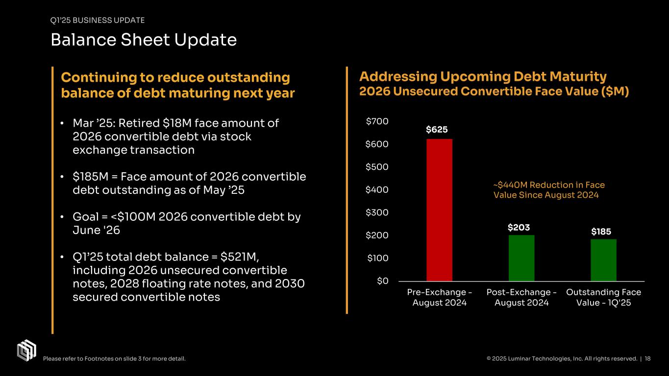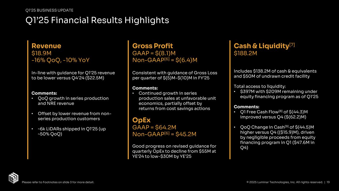 $44 $37 $32 $23 $19 $0 $10 $20 $30 $40 $50 Q1'24 Q2'24 Q3'24 Q4'24 Q1'25 $73 $70 $61 $55 $45 $40 $45 $50 $55 $60 $65 $70 $75 Q1'24 Q2'24 Q3'24 Q4'24 Q1'25 Q1’25 BUSINESS UPDATE Cost Actions Update Cost actions are not expected to adversely impact our execution in a material way Quarterly Non-GAAP[6] Operating Expenses ($M) Quarterly Stock-Based Compensation ($M) Savings Realized © 2025 Luminar Technologies, Inc. All rights reserved. | 17 GAAP: $115 $114 $102 $78 $64 Savings Realized Lowering YE’25 quarterly OpEx target from mid/high-$30M to low-$30M range Please refer to Footnotes on slide 3 for more detail.