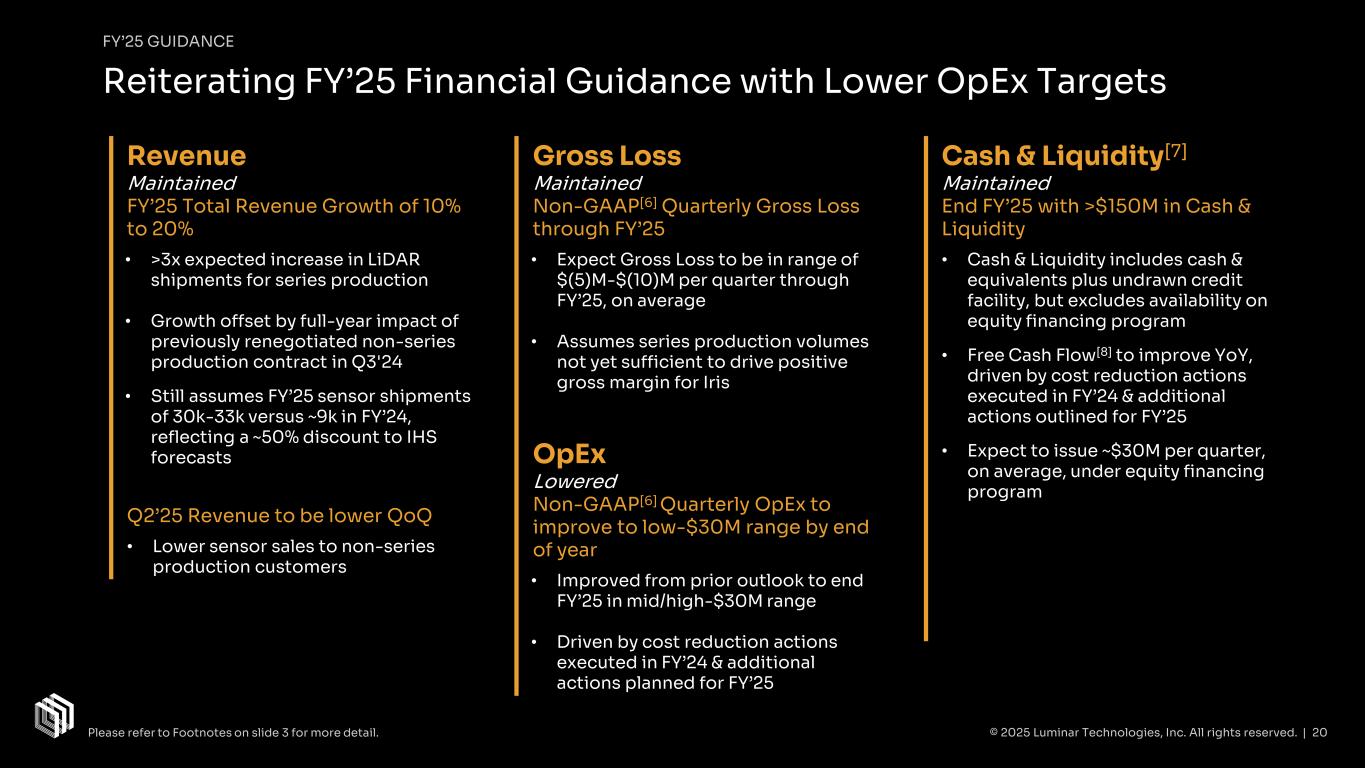 Revenue $18.9M -16% QoQ, -10% YoY In-line with guidance for Q1’25 revenue to be lower versus Q4'24 ($22.5M) Comments: • QoQ growth in series production and NRE revenue • Offset by lower revenue from non- series production customers • ~6k LiDARs shipped in Q1’25 (up ~50% QoQ) Gross Profit GAAP = $(8.1)M Non-GAAP[6] = $(6.4)M Consistent with guidance of Gross Loss per quarter of $(5)M-$(10)M in FY’25 Comments: • Continued growth in series production sales at unfavorable unit economics, partially offset by returns from cost savings actions OpEx GAAP = $64.2M Non-GAAP[6] = $45.2M Good progress on revised guidance for quarterly OpEx to decline from $55M at YE’24 to low-$30M by YE’25 Cash & Liquidity[7] $188.2M Includes $138.2M of cash & equivalents and $50M of undrawn credit facility Total access to liquidity: • $397M with $209M remaining under equity financing program as of Q1’25 Comments: • Q1 Free Cash Flow[8] of $(44.3)M improved versus Q4 ($(62.2)M) • QoQ Change in Cash[9] of $(44.5)M higher versus Q4 (($15.9)M), driven by negligible proceeds from equity financing program in Q1 ($47.6M in Q4) Q1’25 BUSINESS UPDATE Q1’25 Financial Results Highlights © 2025 Luminar Technologies, Inc. All rights reserved. | 19Please refer to Footnotes on slide 3 for more detail.