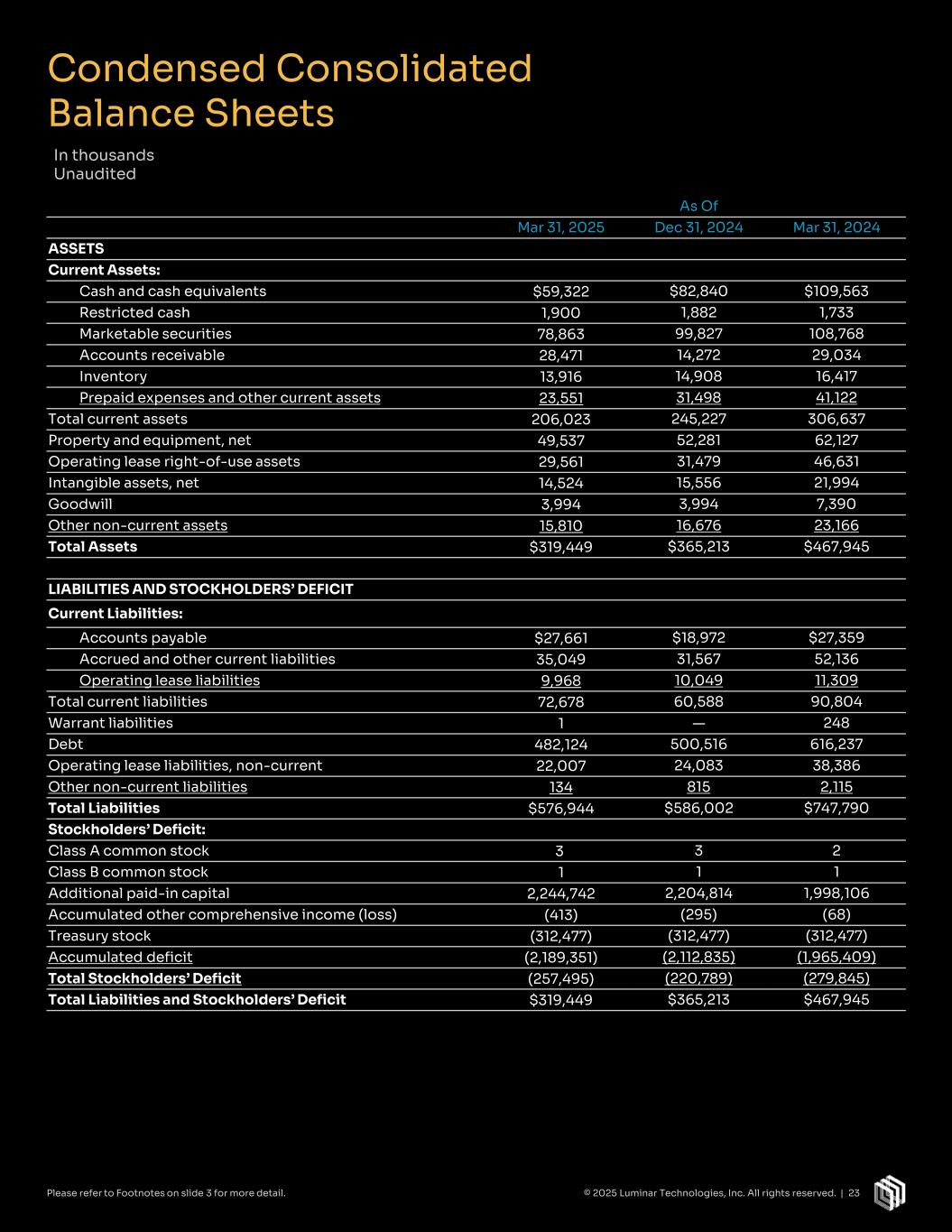 As Of Mar 31, 2025 Dec 31, 2024 Mar 31, 2024 ASSETS Current Assets: Cash and cash equivalents $59,322 $82,840 $109,563 Restricted cash 1,900 1,882 1,733 Marketable securities 78,863 99,827 108,768 Accounts receivable 28,471 14,272 29,034 Inventory 13,916 14,908 16,417 Prepaid expenses and other current assets 23,551 31,498 41,122 Total current assets 206,023 245,227 306,637 Property and equipment, net 49,537 52,281 62,127 Operating lease right-of-use assets 29,561 31,479 46,631 Intangible assets, net 14,524 15,556 21,994 Goodwill 3,994 3,994 7,390 Other non-current assets 15,810 16,676 23,166 Total Assets $319,449 $365,213 $467,945 LIABILITIES AND STOCKHOLDERS’ DEFICIT Current Liabilities: Accounts payable $27,661 $18,972 $27,359 Accrued and other current liabilities 35,049 31,567 52,136 Operating lease liabilities 9,968 10,049 11,309 Total current liabilities 72,678 60,588 90,804 Warrant liabilities 1 — 248 Debt 482,124 500,516 616,237 Operating lease liabilities, non-current 22,007 24,083 38,386 Other non-current liabilities 134 815 2,115 Total Liabilities $576,944 $586,002 $747,790 Stockholders’ Deficit: Class A common stock 3 3 2 Class B common stock 1 1 1 Additional paid-in capital 2,244,742 2,204,814 1,998,106 Accumulated other comprehensive income (loss) (413) (295) (68) Treasury stock (312,477) (312,477) (312,477) Accumulated deficit (2,189,351) (2,112,835) (1,965,409) Total Stockholders’ Deficit (257,495) (220,789) (279,845) Total Liabilities and Stockholders’ Deficit $319,449 $365,213 $467,945 Condensed Consolidated Balance Sheets In thousands Unaudited © 2025 Luminar Technologies, Inc. All rights reserved. | 23Please refer to Footnotes on slide 3 for more detail.