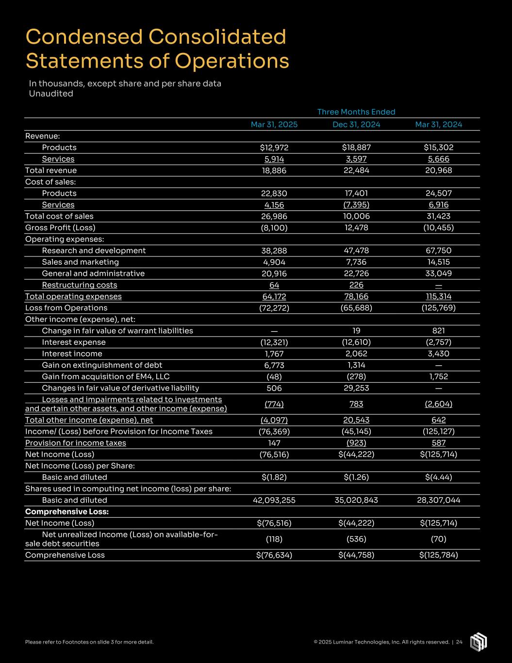 Condensed Consolidated Statements of Operations In thousands, except share and per share data Unaudited Three Months Ended Mar 31, 2025 Dec 31, 2024 Mar 31, 2024 Revenue: Products $12,972 $18,887 $15,302 Services 5,914 3,597 5,666 Total revenue 18,886 22,484 20,968 Cost of sales: Products 22,830 17,401 24,507 Services 4,156 (7,395) 6,916 Total cost of sales 26,986 10,006 31,423 Gross Profit (Loss) (8,100) 12,478 (10,455) Operating expenses: Research and development 38,288 47,478 67,750 Sales and marketing 4,904 7,736 14,515 General and administrative 20,916 22,726 33,049 Restructuring costs 64 226 — Total operating expenses 64,172 78,166 115,314 Loss from Operations (72,272) (65,688) (125,769) Other income (expense), net: Change in fair value of warrant liabilities — 19 821 Interest expense (12,321) (12,610) (2,757) Interest income 1,767 2,062 3,430 Gain on extinguishment of debt 6,773 1,314 — Gain from acquisition of EM4, LLC (48) (278) 1,752 Changes in fair value of derivative liability 506 29,253 — Losses and impairments related to investments and certain other assets, and other income (expense) (774) 783 (2,604) Total other income (expense), net (4,097) 20,543 642 Income/ (Loss) before Provision for Income Taxes (76,369) (45,145) (125,127) Provision for income taxes 147 (923) 587 Net Income (Loss) (76,516) $(44,222) $(125,714) Net Income (Loss) per Share: Basic and diluted $(1.82) $(1.26) $(4.44) Shares used in computing net income (loss) per share: Basic and diluted 42,093,255 35,020,843 28,307,044 Comprehensive Loss: Net Income (Loss) $(76,516) $(44,222) $(125,714) Net unrealized Income (Loss) on available-for- sale debt securities (118) (536) (70) Comprehensive Loss $(76,634) $(44,758) $(125,784) © 2025 Luminar Technologies, Inc. All rights reserved. | 24Please refer to Footnotes on slide 3 for more detail.