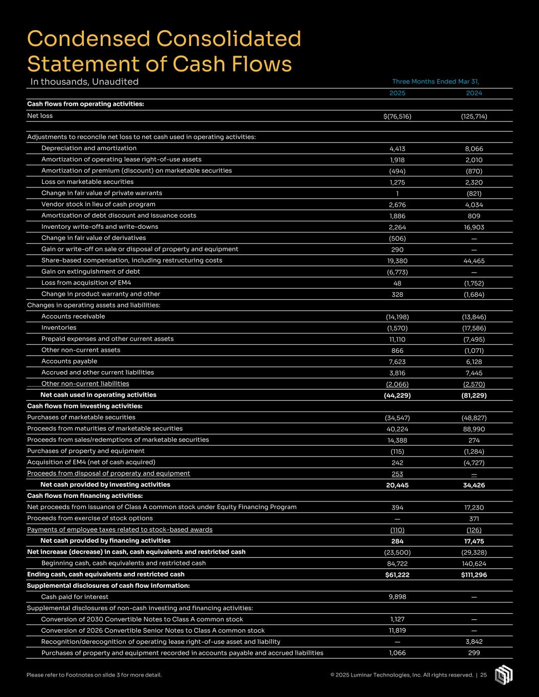 Three Months Ended Mar 31, 2025 2024 Cash flows from operating activities: Net loss $(76,516) (125,714) Adjustments to reconcile net loss to net cash used in operating activities: Depreciation and amortization 4,413 8,066 Amortization of operating lease right-of-use assets 1,918 2,010 Amortization of premium (discount) on marketable securities (494) (870) Loss on marketable securities 1,275 2,320 Change in fair value of private warrants 1 (821) Vendor stock in lieu of cash program 2,676 4,034 Amortization of debt discount and issuance costs 1,886 809 Inventory write-offs and write-downs 2,264 16,903 Change in fair value of derivatives (506) — Gain or write-off on sale or disposal of property and equipment 290 — Share-based compensation, including restructuring costs 19,380 44,465 Gain on extinguishment of debt (6,773) — Loss from acquisition of EM4 48 (1,752) Change in product warranty and other 328 (1,684) Changes in operating assets and liabilities: Accounts receivable (14,198) (13,846) Inventories (1,570) (17,586) Prepaid expenses and other current assets 11,110 (7,495) Other non-current assets 866 (1,071) Accounts payable 7,623 6,128 Accrued and other current liabilities 3,816 7,445 Other non-current liabilities (2,066) (2,570) Net cash used in operating activities (44,229) (81,229) Cash flows from investing activities: Purchases of marketable securities (34,547) (48,827) Proceeds from maturities of marketable securities 40,224 88,990 Proceeds from sales/redemptions of marketable securities 14,388 274 Purchases of property and equipment (115) (1,284) Acquisition of EM4 (net of cash acquired) 242 (4,727) Proceeds from disposal of properaty and equipment 253 — Net cash provided by investing activities 20,445 34,426 Cash flows from financing activities: Net proceeds from issuance of Class A common stock under Equity Financing Program 394 17,230 Proceeds from exercise of stock options — 371 Payments of employee taxes related to stock-based awards (110) (126) Net cash provided by financing activities 284 17,475 Net increase (decrease) in cash, cash equivalents and restricted cash (23,500) (29,328) Beginning cash, cash equivalents and restricted cash 84,722 140,624 Ending cash, cash equivalents and restricted cash $61,222 $111,296 Supplemental disclosures of cash flow information: Cash paid for interest 9,898 — Supplemental disclosures of non-cash investing and financing activities: Conversion of 2030 Convertible Notes to Class A common stock 1,127 — Conversion of 2026 Convertible Senior Notes to Class A common stock 11,819 — Recognition/derecognition of operating lease right-of-use asset and liability — 3,842 Purchases of property and equipment recorded in accounts payable and accrued liabilities 1,066 299 Condensed Consolidated Statement of Cash Flows In thousands, Unaudited © 2025 Luminar Technologies, Inc. All rights reserved. | 25Please refer to Footnotes on slide 3 for more detail.