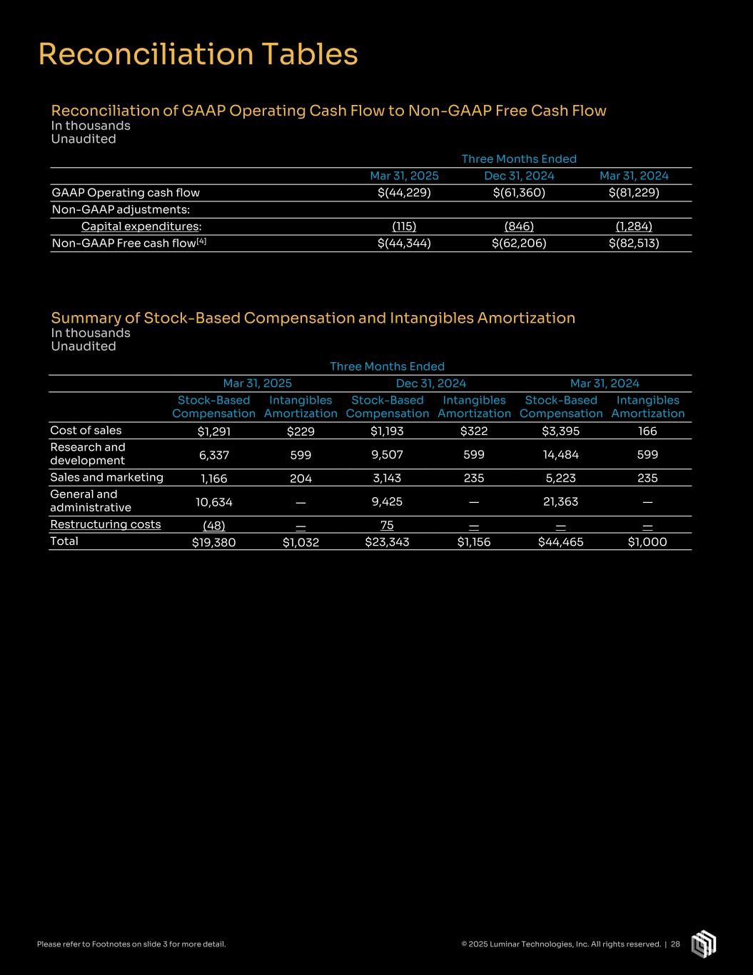 Reconciliation Tables Reconciliation of GAAP Operating Cash Flow to Non-GAAP Free Cash Flow In thousands Unaudited Summary of Stock-Based Compensation and Intangibles Amortization In thousands Unaudited Three Months Ended Mar 31, 2025 Dec 31, 2024 Mar 31, 2024 GAAP Operating cash flow $(44,229) $(61,360) $(81,229) Non-GAAP adjustments: Capital expenditures: (115) (846) (1,284) Non-GAAP Free cash flow[4] $(44,344) $(62,206) $(82,513) Three Months Ended Mar 31, 2025 Dec 31, 2024 Mar 31, 2024 Stock-Based Compensation Intangibles Amortization Stock-Based Compensation Intangibles Amortization Stock-Based Compensation Intangibles Amortization Cost of sales $1,291 $229 $1,193 $322 $3,395 166 Research and development 6,337 599 9,507 599 14,484 599 Sales and marketing 1,166 204 3,143 235 5,223 235 General and administrative 10,634 — 9,425 — 21,363 — Restructuring costs (48) — 75 — — — Total $19,380 $1,032 $23,343 $1,156 $44,465 $1,000 Please refer to Footnotes on slide 3 for more detail. © 2025 Luminar Technologies, Inc. All rights reserved. | 28